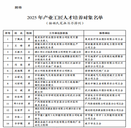 湖北省经贸工会为深化产业工人队伍建设改革,积极融入大国工匠、荆楚工匠培育体系,自2025年起实施产业工匠人才培养行动。本年度经组织推荐、严格审核并报省总工会党组审议,最终确定全省共50人入选产业工匠人才培养对象。